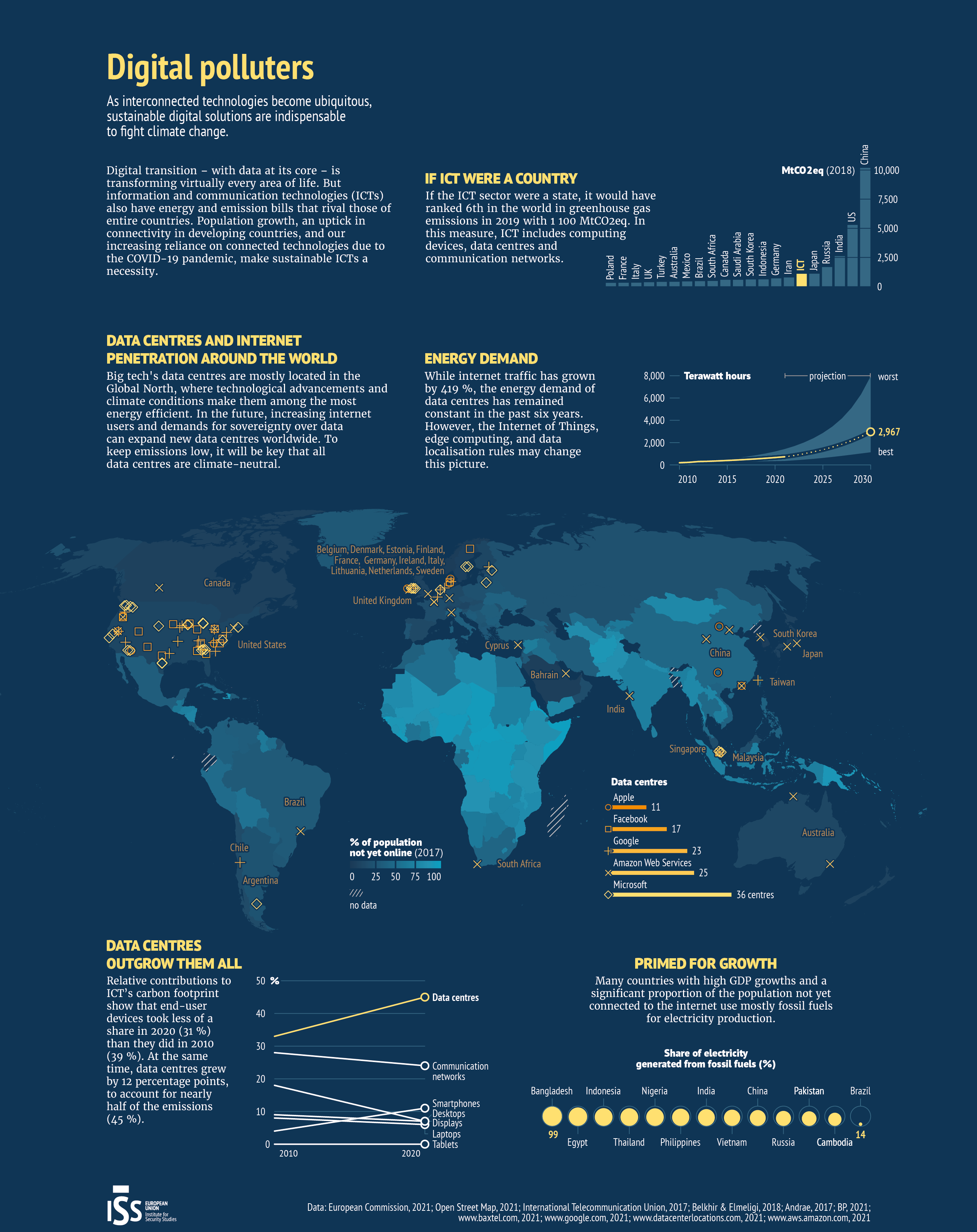 <p>However, our increasingly digital way of life comes at a cost for the environment. The 2020 speech ‘The state of the planet’ by UN Secretary-General António Guterres made it clear: the world economy needs to transform to embrace a sustainable economic model with cleaner infrastructure, including digital and internet infrastructure.<sup>(4)</sup> It is a global problem that requires a concerted international effort. And yet the environmental impact of new technologies is hardly addressed as a foreign policy issue. The EU–Japan Green Alliance signed in May 2021, despite being relatively comprehensive, does not make any reference to the environmental challenges of digital transition.<sup>(5)</sup> The partnership between the European Commission and Breakthrough Energy Catalyst<sup>(6)</sup> to boost investments in critical climate technologies focuses on green hydrogen, direct air capture, long-duration energy storage and sustainable aviation fuels, but not on the information technology sector.</p>