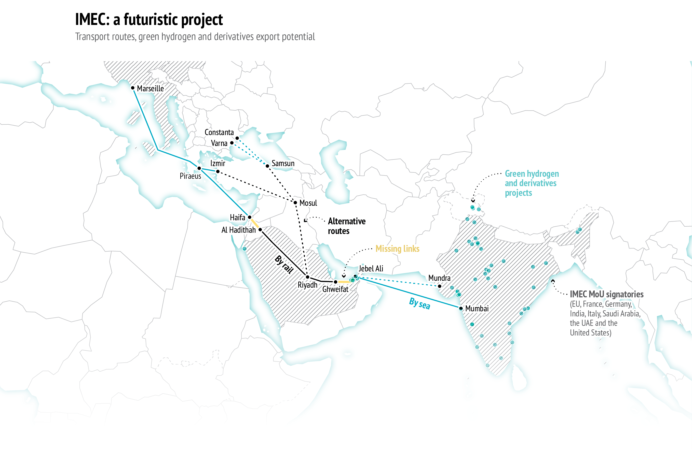 <p>IMEC constitutes a strategic opportunity to diversify and develop new economic corridors between Europe and Asia. This involves transport, digital and telecommunications connectivity via a high-speed data pipeline, as well as a common renewable electricity grid and a green hydrogen pipeline.</p>