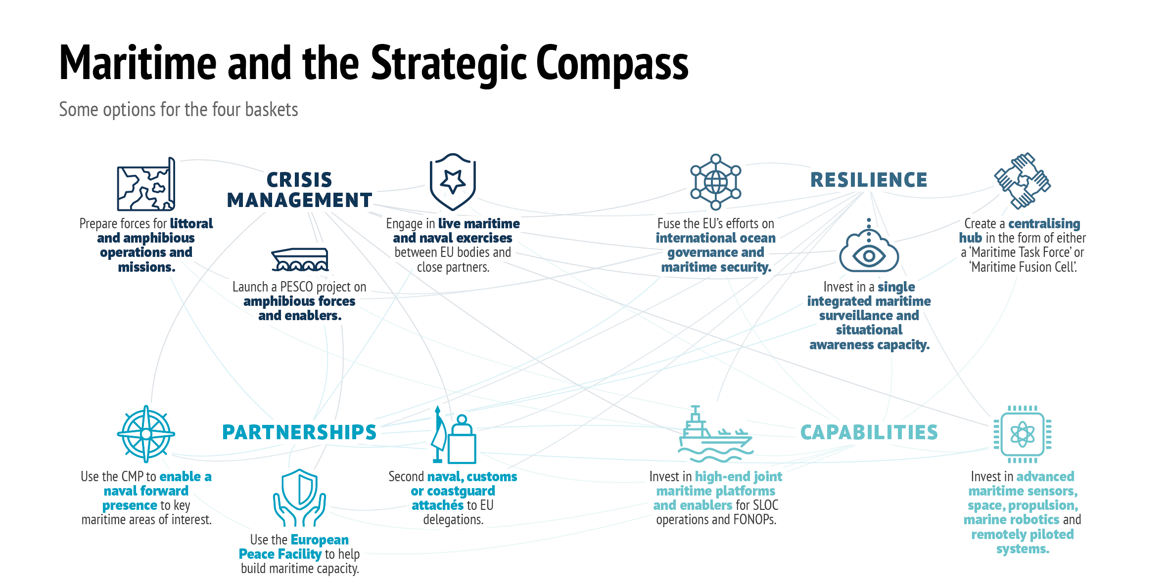 Given the multitude of maritime threats, risks and challenges facing the EU it is necessary to reflect upon the ways in which the Strategic Compass could enhance the Union’s approach to maritime security. We have seen that maritime security concerns are diverse and they emerge across different policy domains and geographical areas. Concrete policy ideas will have to directly respond to the threats outlined above, but it is worth acknowledging that responses cannot be framed solely in naval or hard power terms. A challenge will be how to balance the EU member states’ varied approaches to maritime security. It will also be a test to ensure complementarity between EU maritime security and the Union’s crisis management and capacity building efforts on land, as well as the EU’s broader efforts on ocean governance. With these caveats in mind, we now reflect on how maritime security could be treated by each of the four, interlocking, baskets of the Strategic Compass.