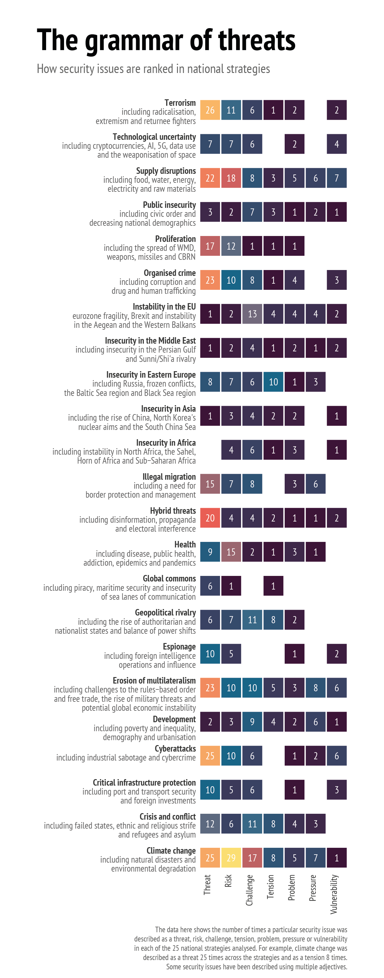 A focus on the word ‘threats’ can, therefore, be relatively revealing of national threat perceptions. For example, it is noteworthy that the strategies of Latvia, the Netherlands and Slovenia have the most references to ‘threats’ even though their strategies are comparably shorter in terms of word count. However, earlier we pointed to how certain security scholars believe that the meaning of ‘threats’ is subjective. While the word 'threats' can be used to denote a sense of urgency or to rally domestic political support for a particular security issue, only analysing threats has limitations. The reality is that national strategies use a range of words to describe how they perceive individual security issues. For example, words such as ‘challenge’, ‘tension’ or ‘problem’ are used to soften the description of a threat and ‘risk’ or ‘vulnerability’ can in turn be used to describe security issues that, despite there being a policy response, will continue to be present over a longer period of time (e.g. climate change or cybersecurity). Additionally, many words are often combined with adjectives to create a sense of urgency or calm (e.g. high risk or low risk).