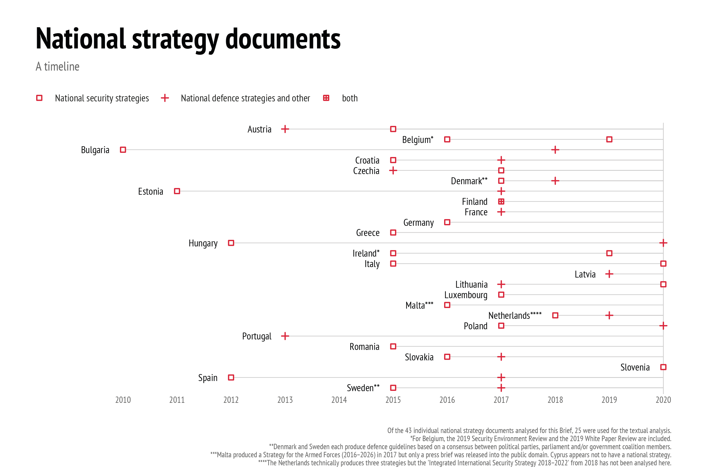 8   This Brief draws on the most up-to-date national security strategies, as these documents provide the most comprehensive description of threats and are the culmination of a wider national consultation and debate. In total, the Brief analysed 18 national security strategies, but if one of these was not readily accessible, it turned to seven defence strategies, defence white papers or national threat assessments. National strategies for Cyprus and Malta were unavailable. Finally, to verify the conclusions of the 18 national security strategies, the data was cross-referenced with national defence strategies. In total, 42 separate national strategic documents were analysed.