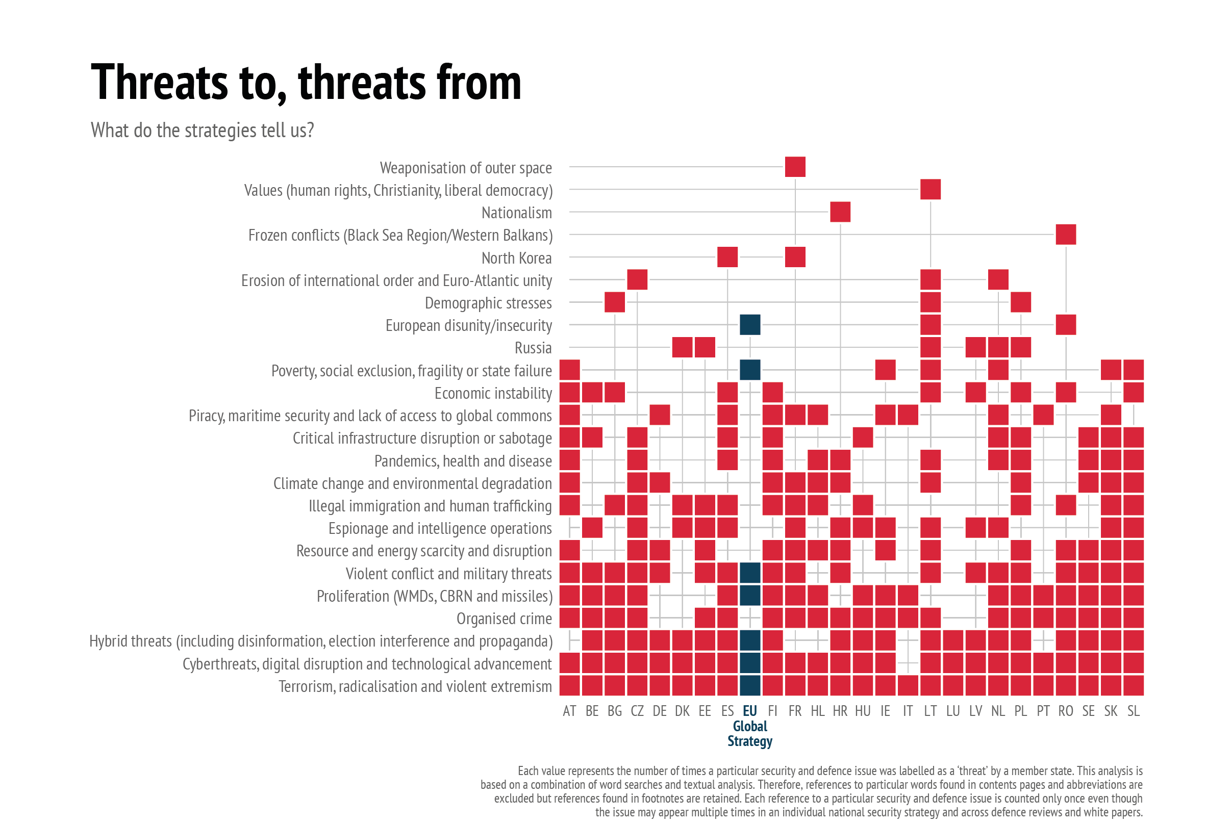 Despite these caveats, comparing 25 of the most recent national strategies reveals some noteworthy indicators about how EU member states perceive threats. For instance, if we conduct a word search for security issues and record them only when they are described as a ‘threat’ in the national strategies, it is possible to build a more complete picture of what issues concern member states. As can be seen from the data (see the ‘Threats from, threats to’ graphic below), there are some unsurprising results. For example, many of the Baltic and central European states classify Russia as a threat when compared to others. On the whole, more than half of the total 25 states analysed agree that terrorism, cybersecurity, hybrid threats,12 organised crime, proliferation, violent conflict, resource and energy supply, espionage and illegal migration are threats (and in this order too). One can also see that pandemics and disease were considered a security threat by many member states long before Covid-19 struck.